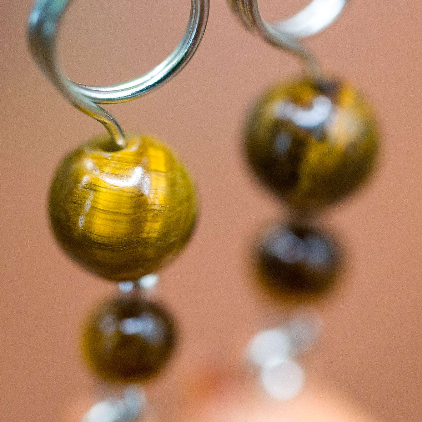 I’ve picked the shiniest tiger eye gem beads to accompany their friendly little faces, and the fitting that touches your ear is made of sterling silver.