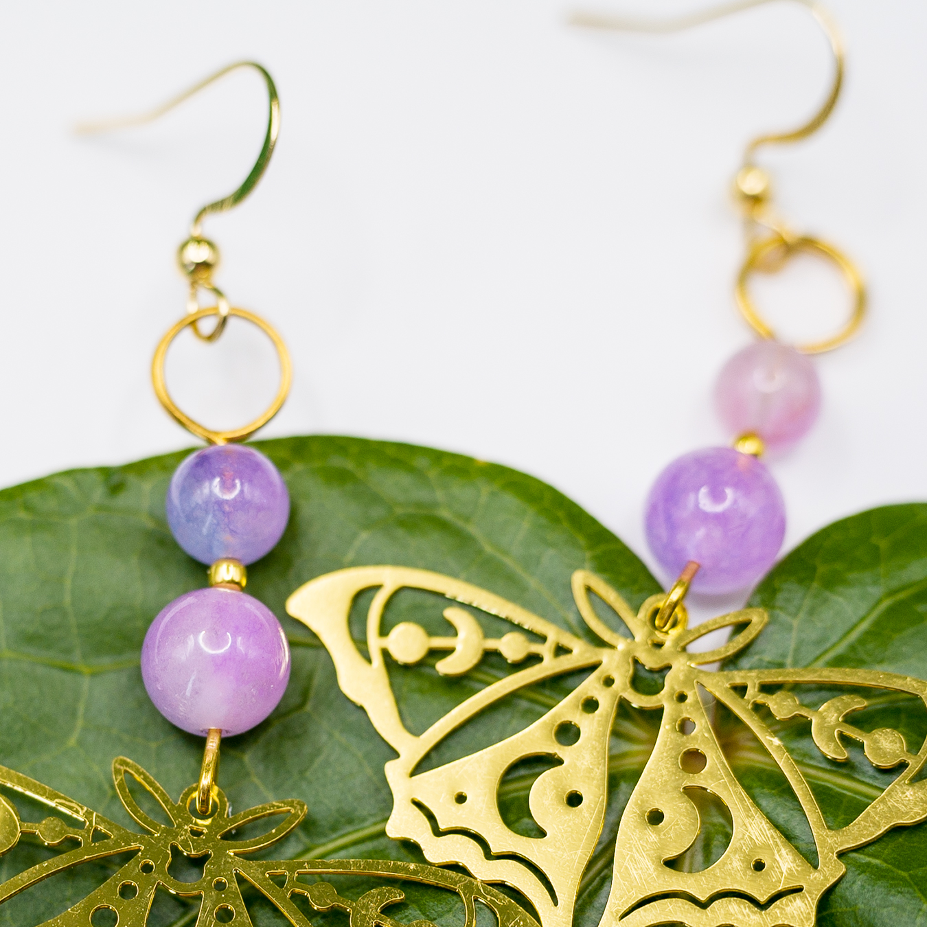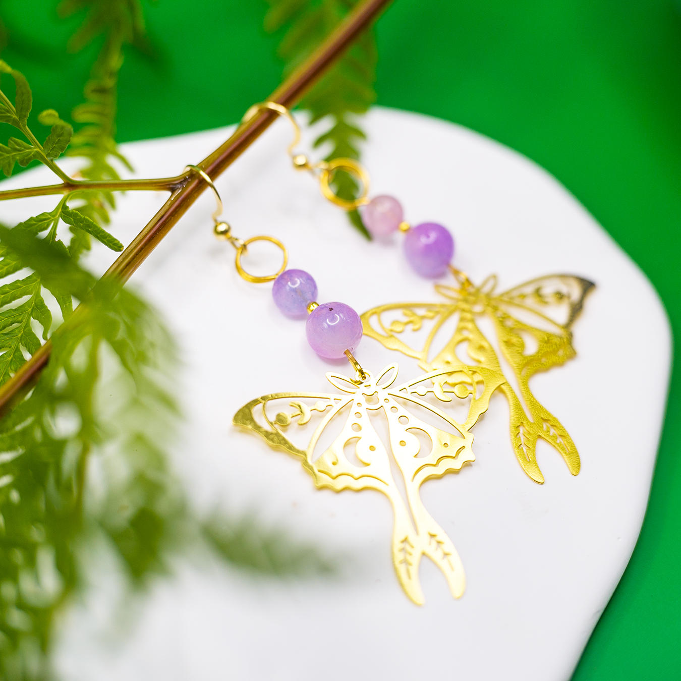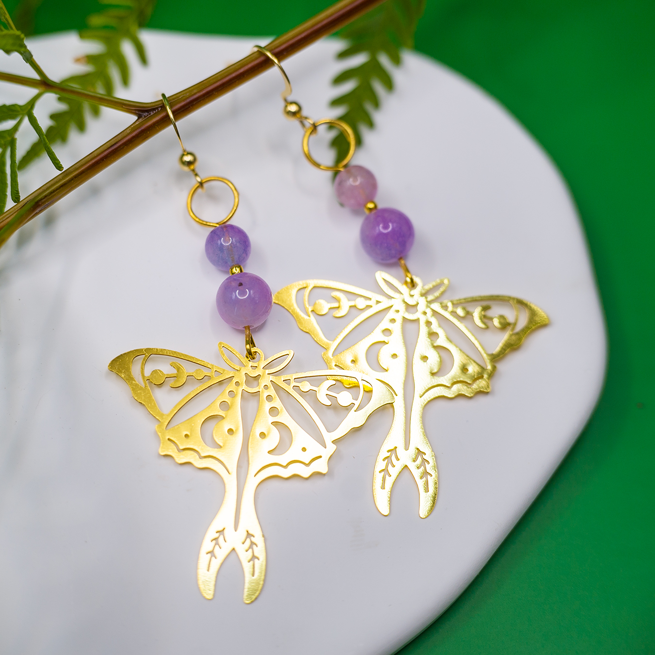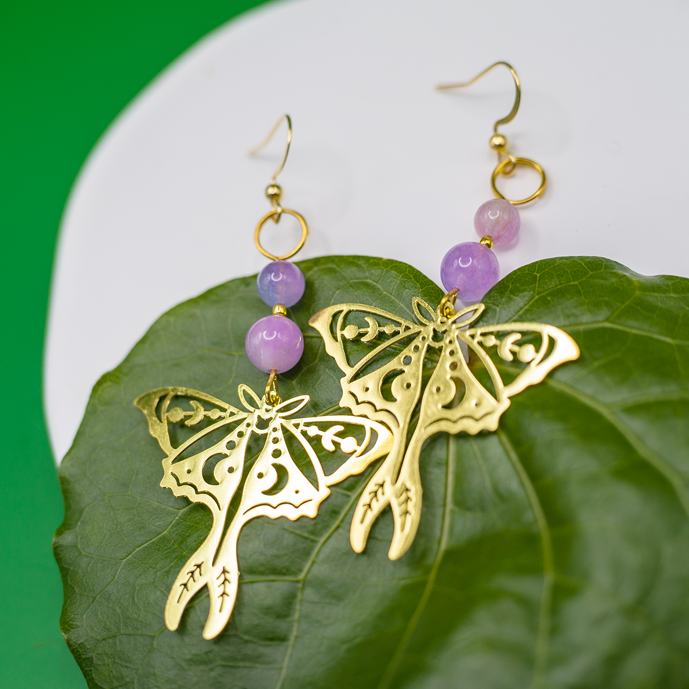These Luna Moth earrings are some real stunners, made out of gold-coloured filigree charms, paired with amethyst beads and gold-plated hooks.